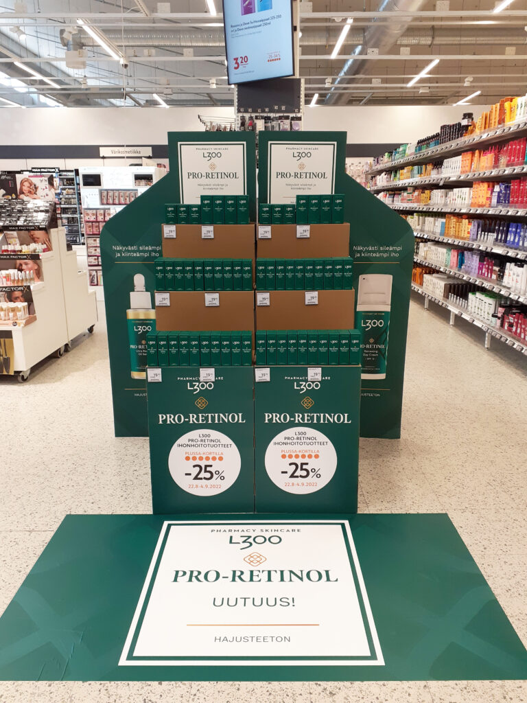 Hyvin suunniteltu esillepano ohjaa asiakkaan huomion juuri oikeaan paikkaan. Se tekee tuotteesta kiinnostavan ja ostamisesta helppoa. Räätälöidyt myymälämateriaalit tuovat esiin myös pienemmät tuotteet, vahvistavat brändiä ja lisäävät myymälässä viipymistä sekä heräteostoja.